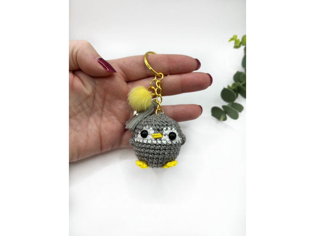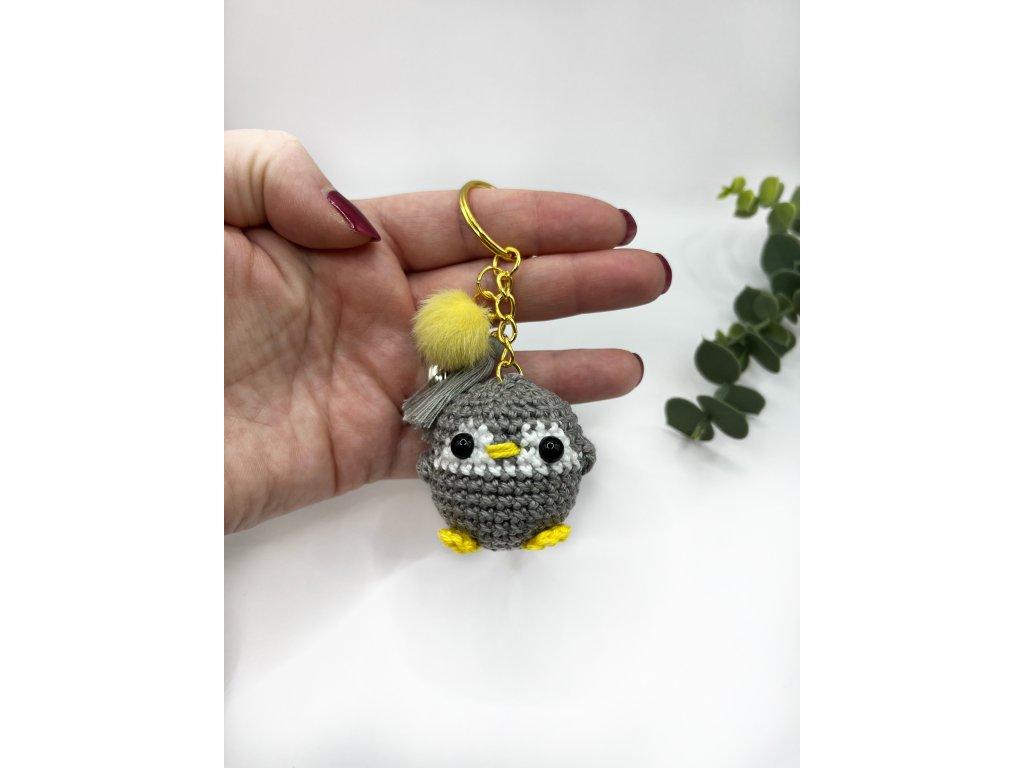 Ručně háčkovaná klíčenka ve tvaru tučňáka s roztomilými doplňky na zlatém kroužku.